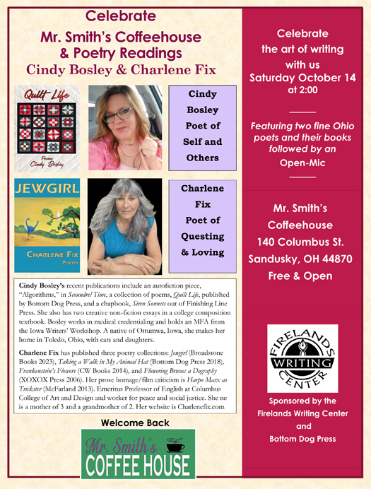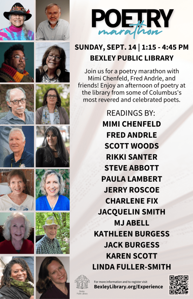 Readings at Bexley Library Poetry Marathon 9/25. Triple Book Launch with Bob Collins & Paula Lambert at Pennington Gallery, 12/1/24. Reading and Interview, diVerses at Stanza (Geoff Anderson), 2025.