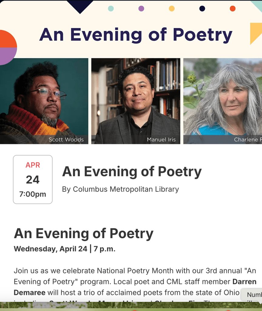 An Evening of Poetry zoom reading for the Columbus Metropolitan Library, April, 2024, with Scott Woods and Manuel Iris https://www.crowdcast.io/c/avp2024-poetry-month